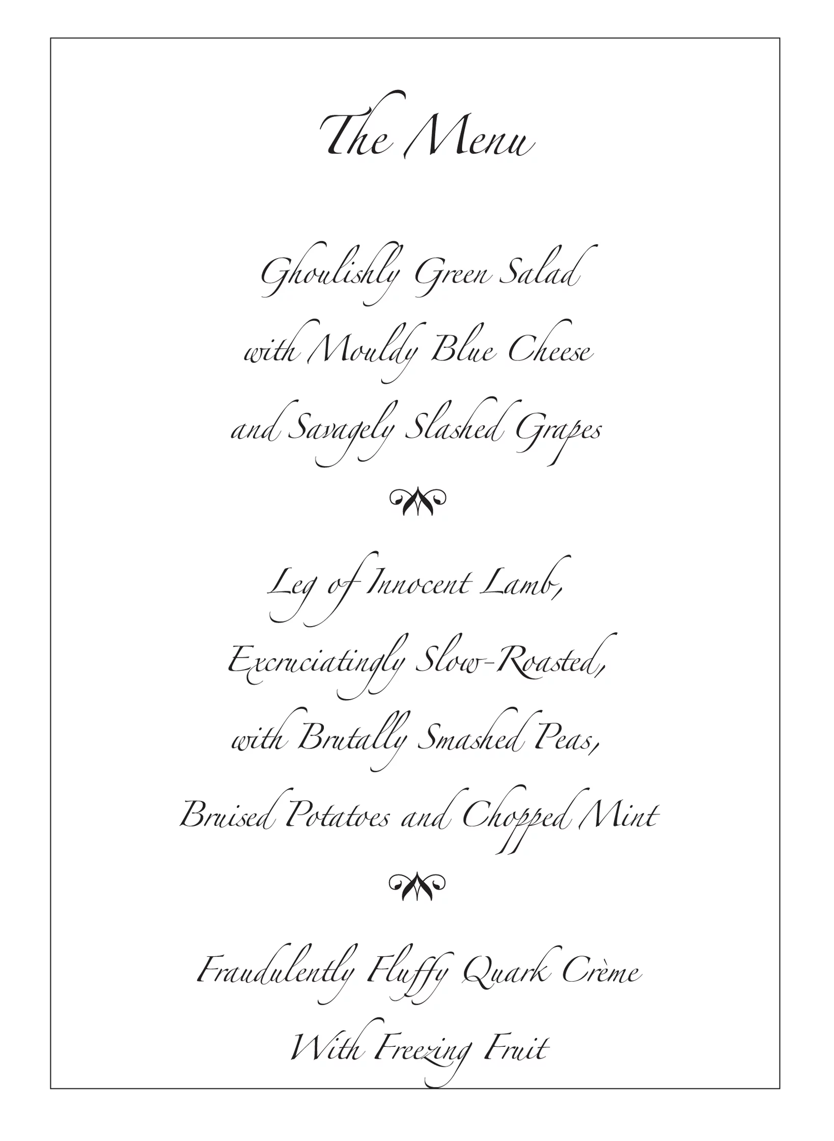The Murder Mystery Dinner Party contains a suggestion for a menu together with the recipes: